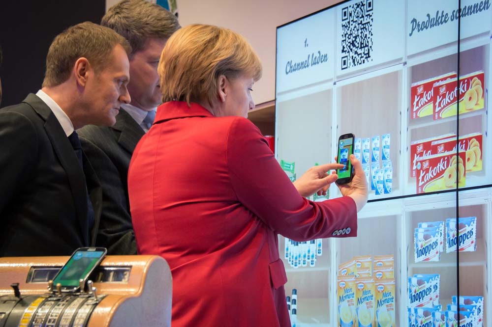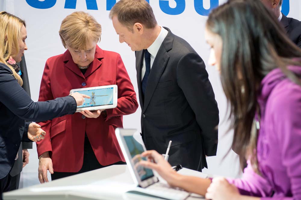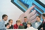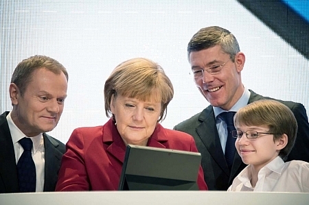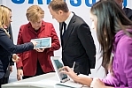 Kanclerz Niemiec Angela Merkel z programistą Felix Guttbier na stoisku firmy Microsoft podczas otwarcia na targach CeBIT