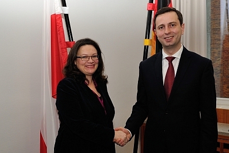 Ministrowie pracy Polski i Niemiec, Władysław Kosiniak-Kamysz i Andrea Nahles przeprowadzili rozmowy w Berlinie, 30 stycznia, dot. skutków wprowadzenia ustawy o płacy minimalnej.